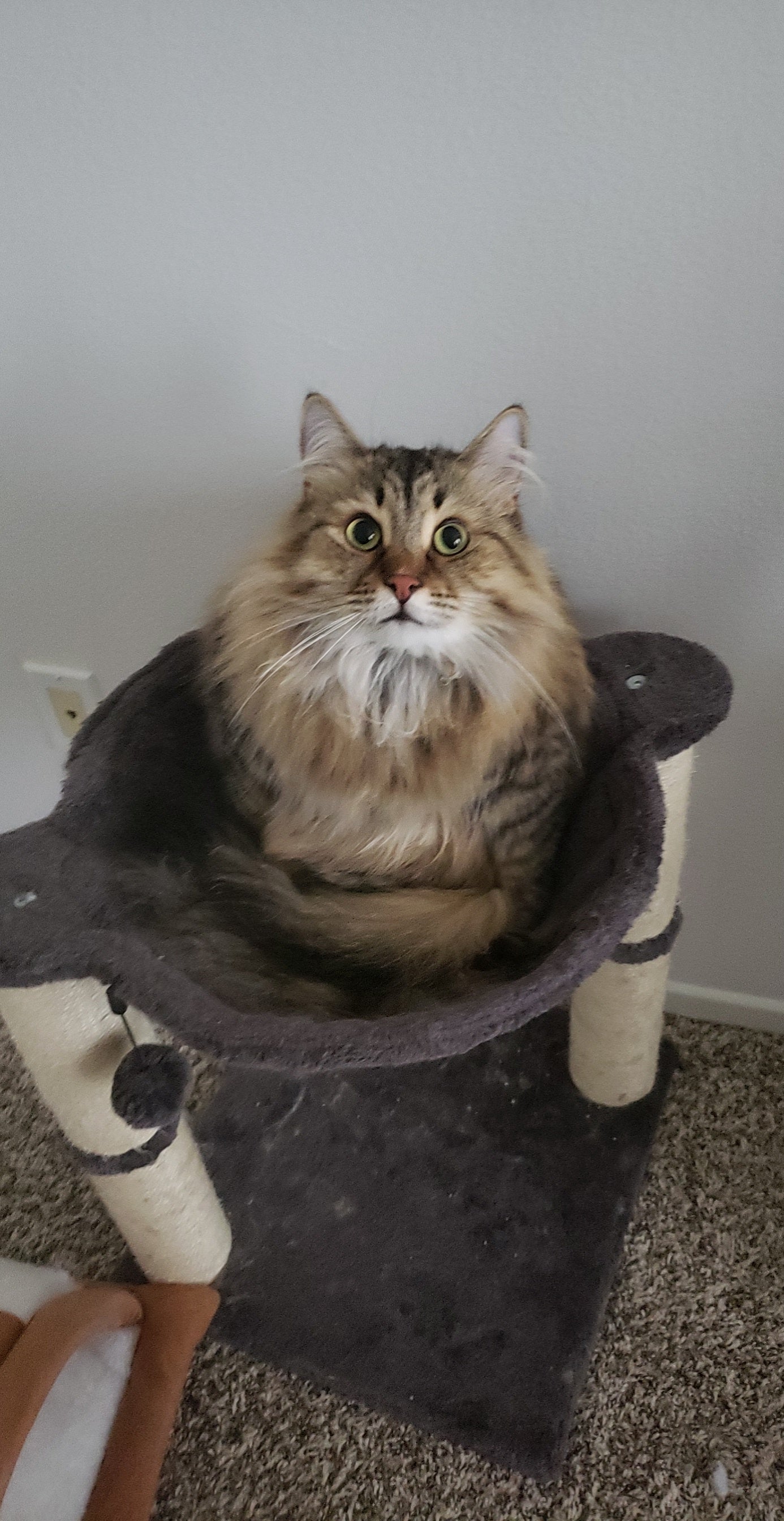 Personality: Like most cats, Bogey is ultra athletic, albeit not as gracious in landing. He’s a very docile cat who prefers to lounge on warm surfaces rather than run around and play. He does not mind strangers coming into the house and greets them with his fluffy tail in the sky. He is also welcoming of other pets. Bailey was introduced after 2 days and Bogey never hissed at her. Bogey does okay with brushing, but does get over stimulated relatively quickly so I typically brush him in short sessions.